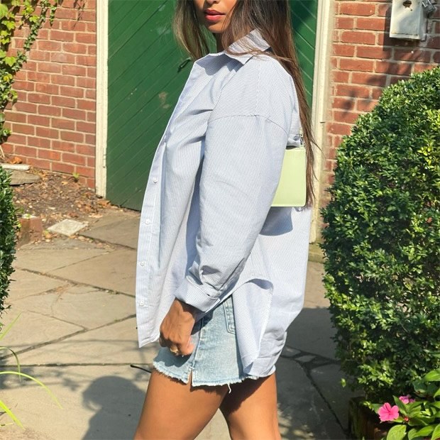 On Sunday, the 21-year-old dropped a series of her casual yet chic street style photos from New York while she posed for the camera in a beautiful Garden setup. She was seen in a light blue white striped oversized open button shirt along with a black tank top underneath styled with denim blue shorts. She also added a mint green baguette bag and a pair of black shoes.